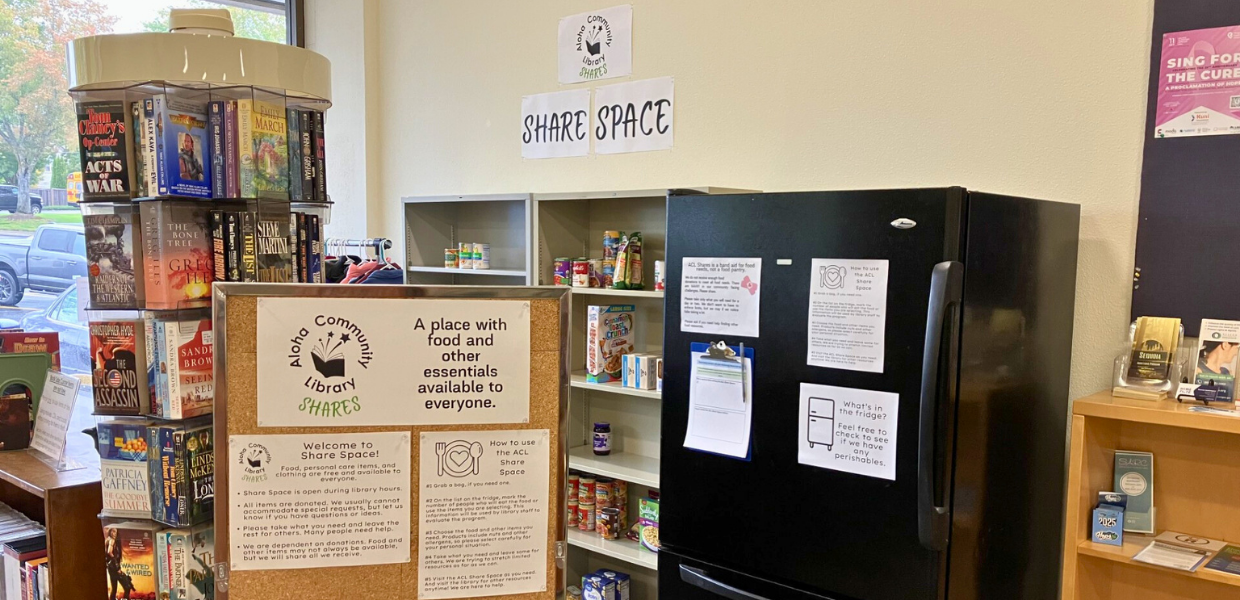 Share Space is an area at the front of the library where food, personal care items, and other donated items are free and available to everyone. It is open during library hours. We are dependent on community donations to stock the shelves. There may not always be food available, but we will share all that we receive with our neighbors.